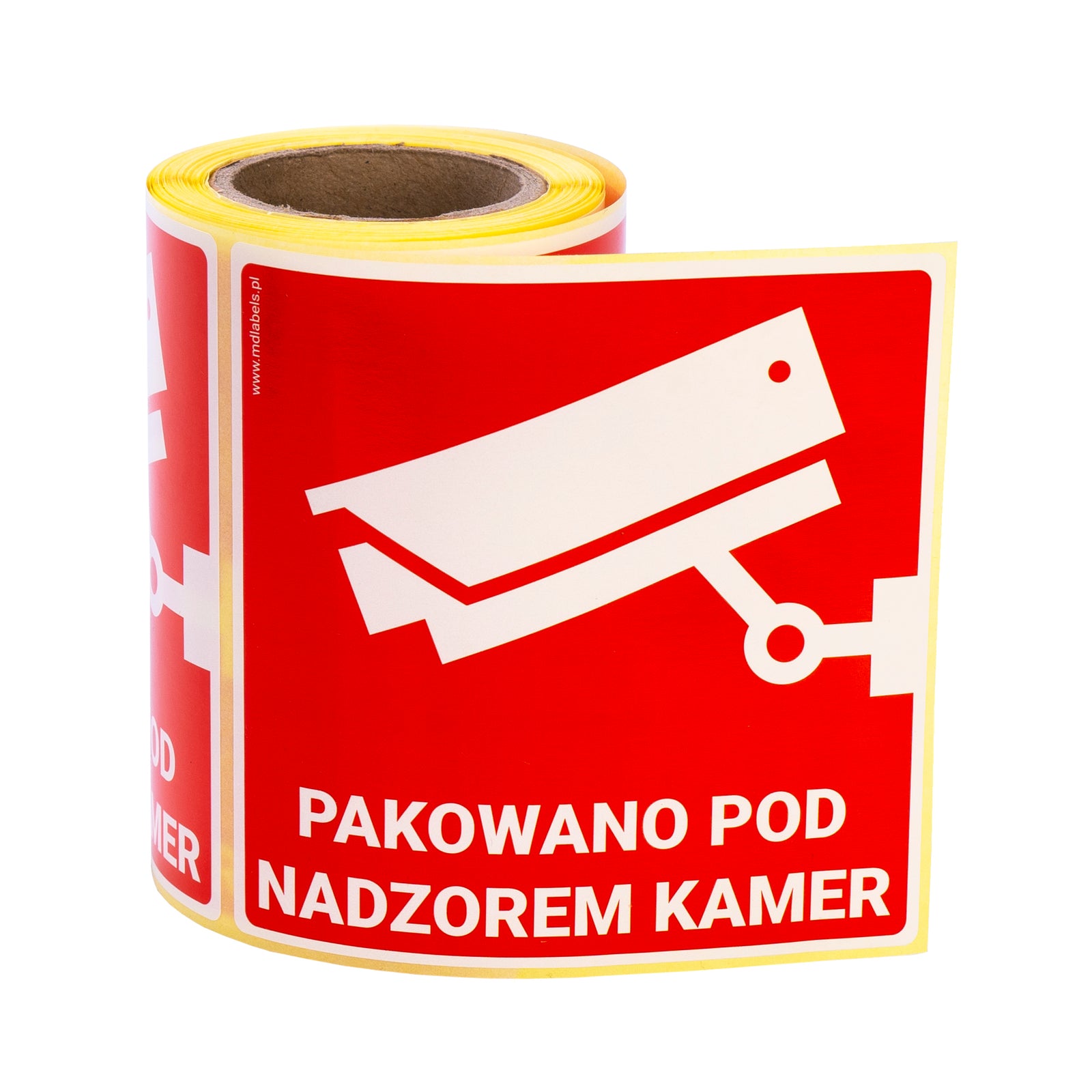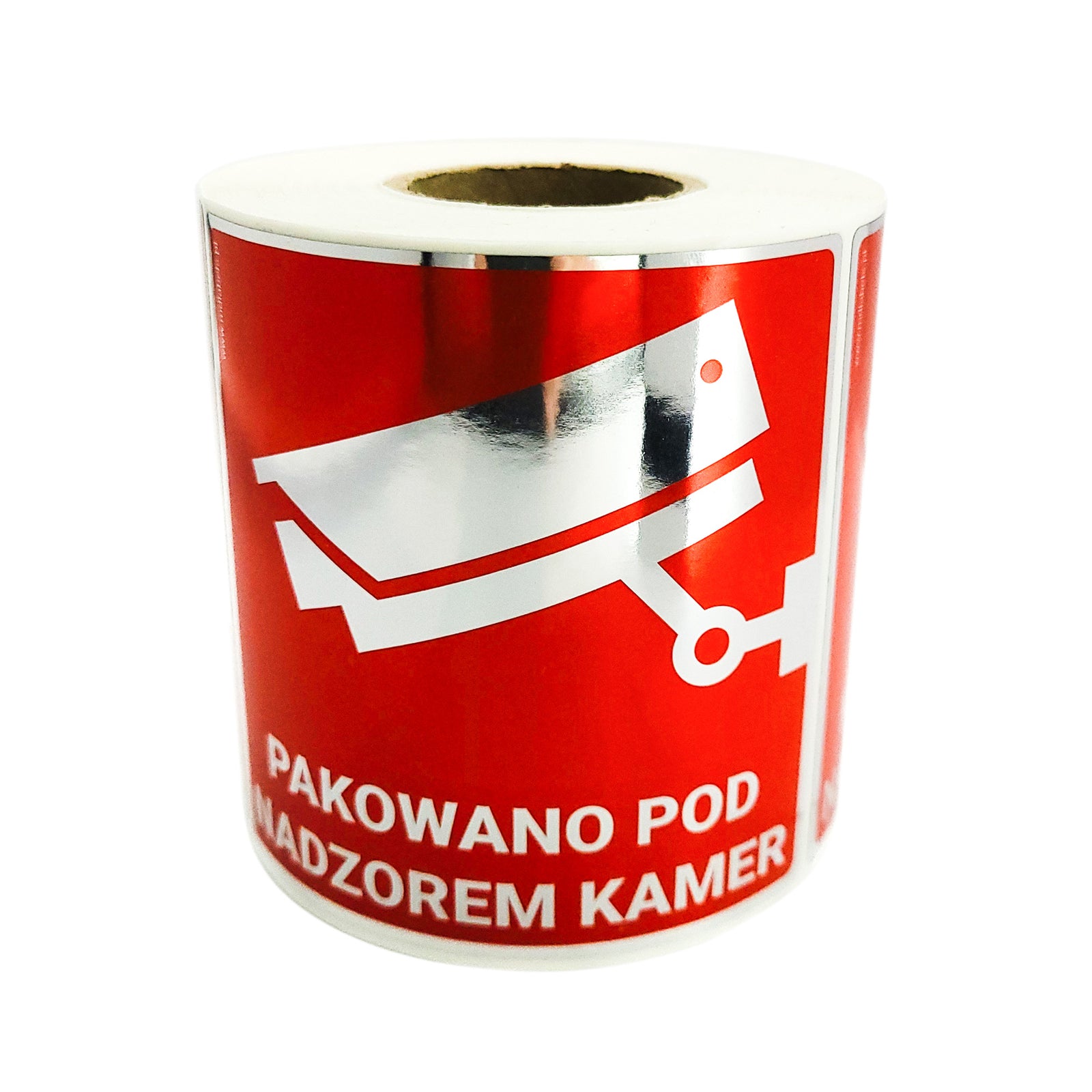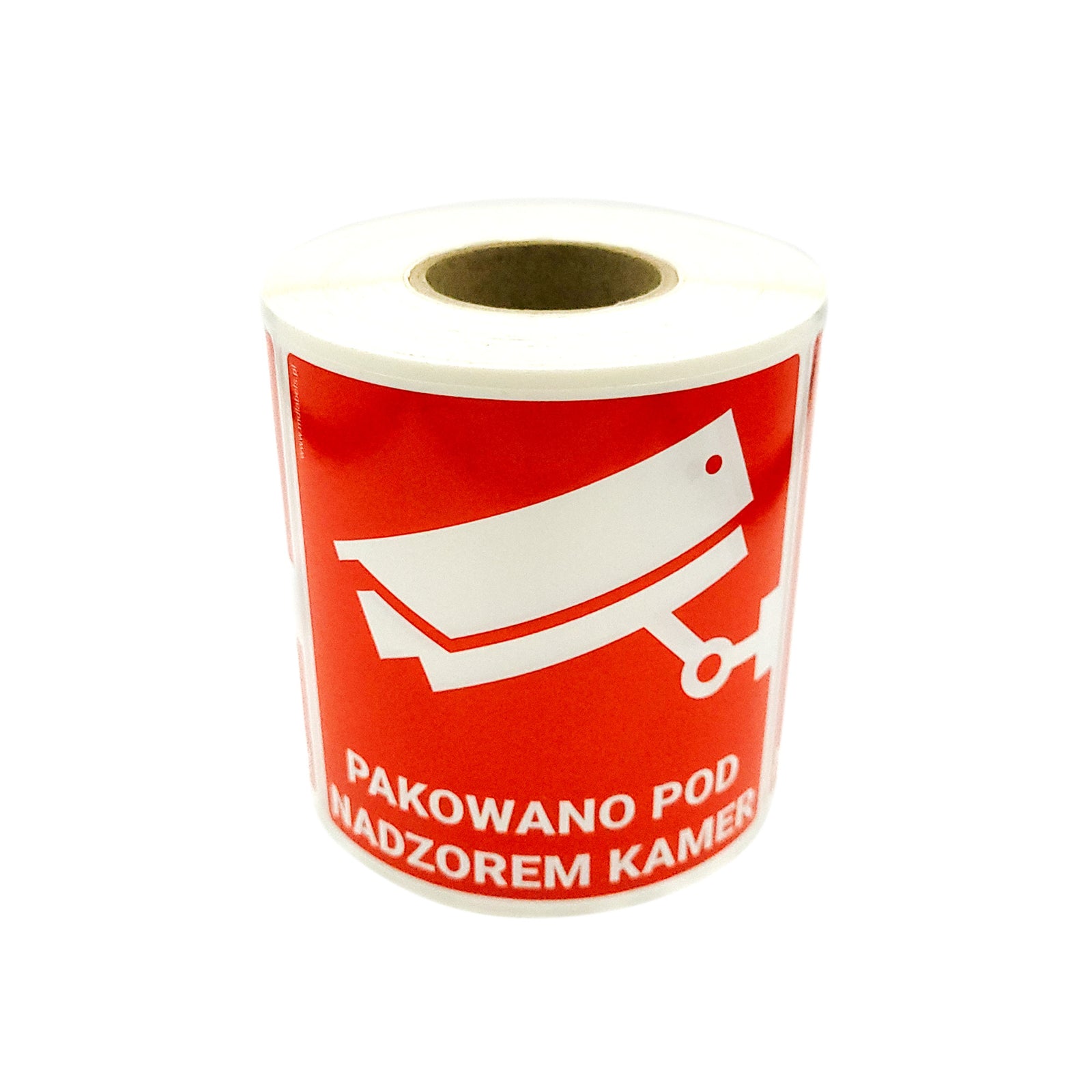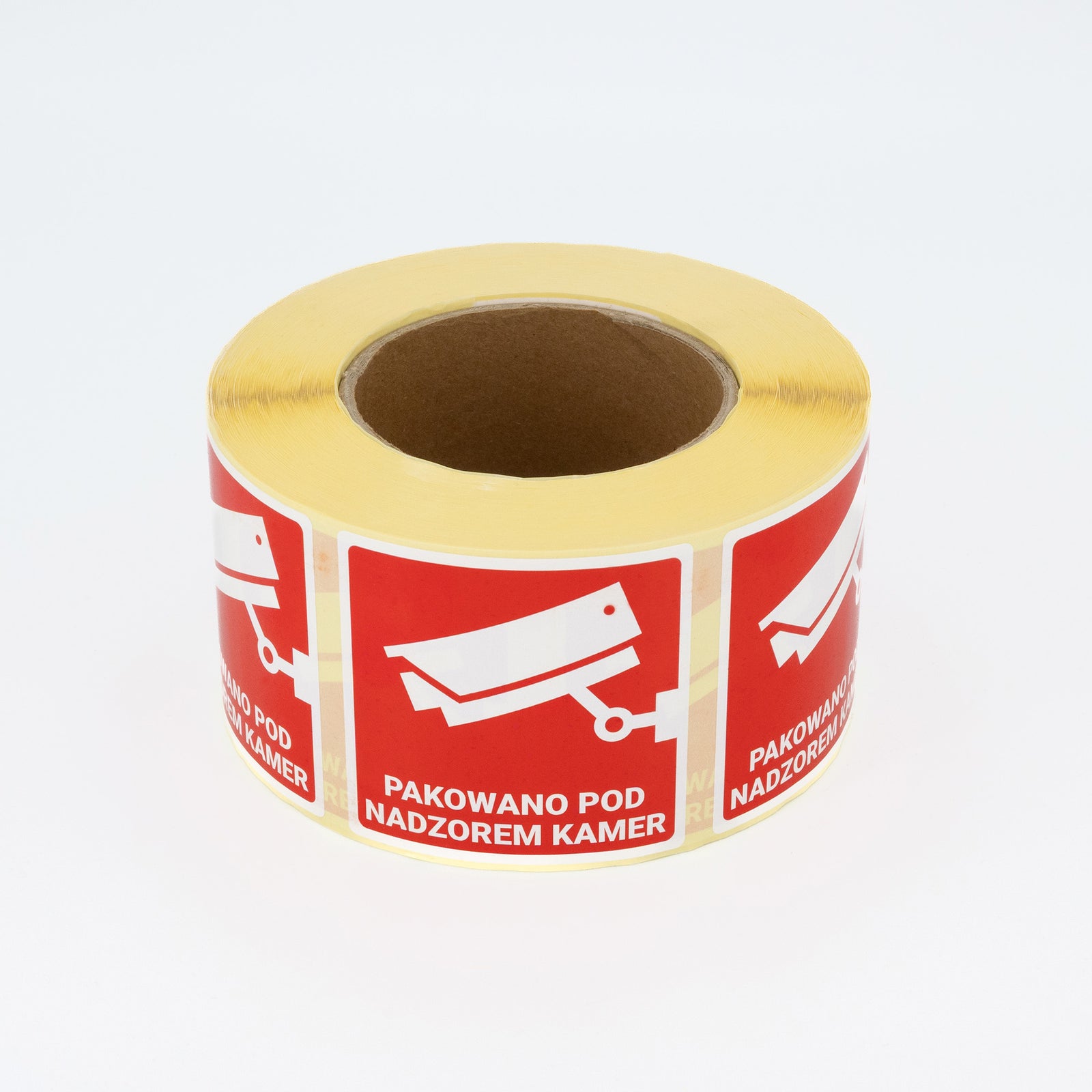 Samoprzylepne etykiety ostrzegawcze - folia PP - pakowane pod nadzorem kamery! - 98x98mm 500 na rolkę