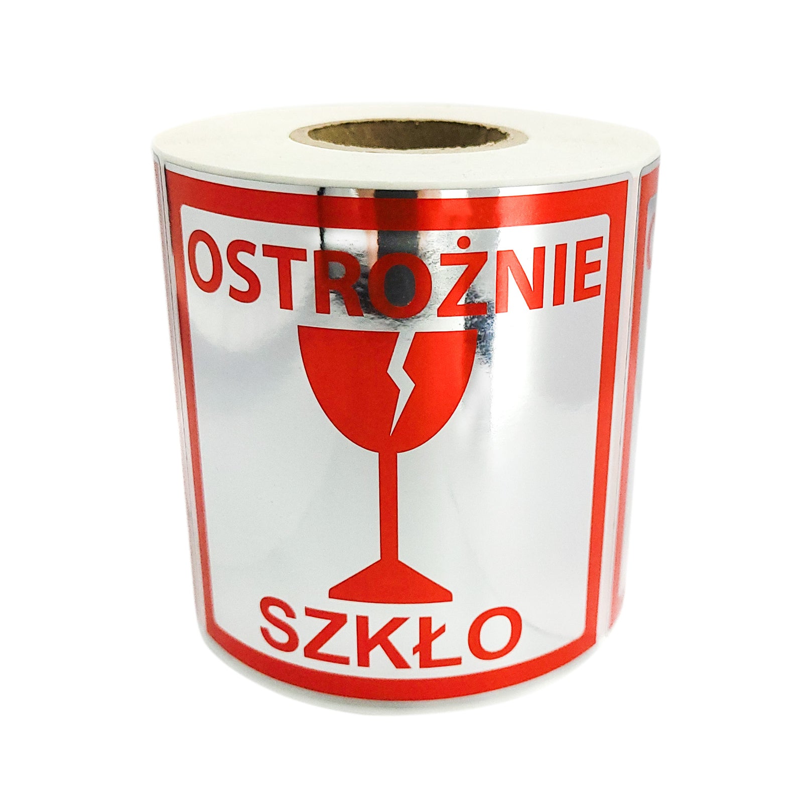Samoprzylepne etykiety ostrzegawcze - SREBRNA FOLIA PP - UWAGA SZKŁO - 98x98mm 500 na rolkę