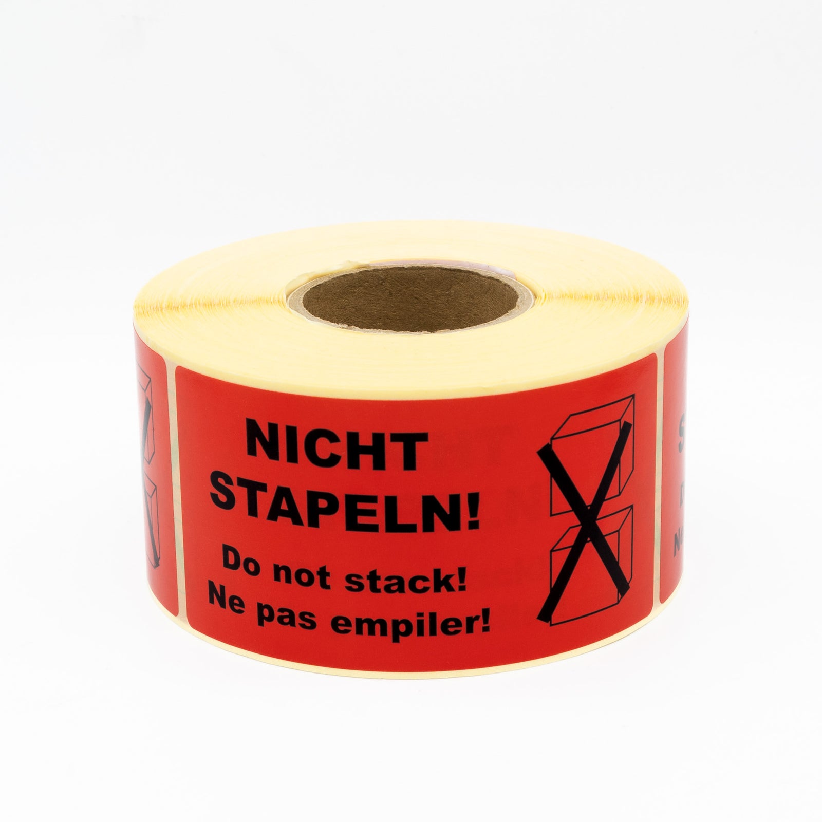 Etykiety ostrzegawcze na rolce 100 x 50 mm NICHT STAPELN! Nie układać w stosy! Ne pas empiler! 500 szt.