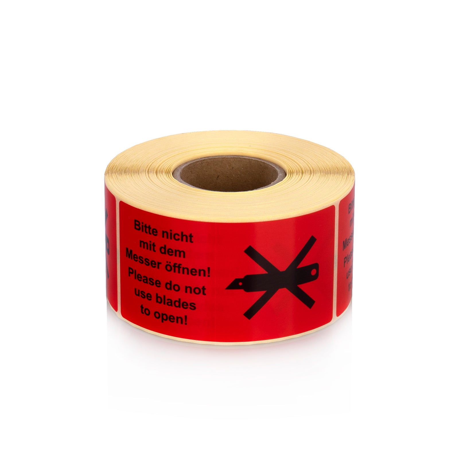 Etykiety ostrzegawcze 100 x 50 mm Bitte nicht mit dem Messer öffnen!- Please do not use blades to open! 500 szt.